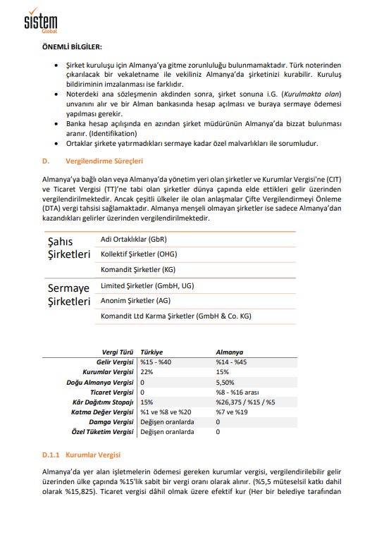 - Bunların yanı sıra Almanya'da şirket kuruluşu kurumlar vergisi oranları açısından da makuldür ve bölgesel teşviklerle desteklenebilir.