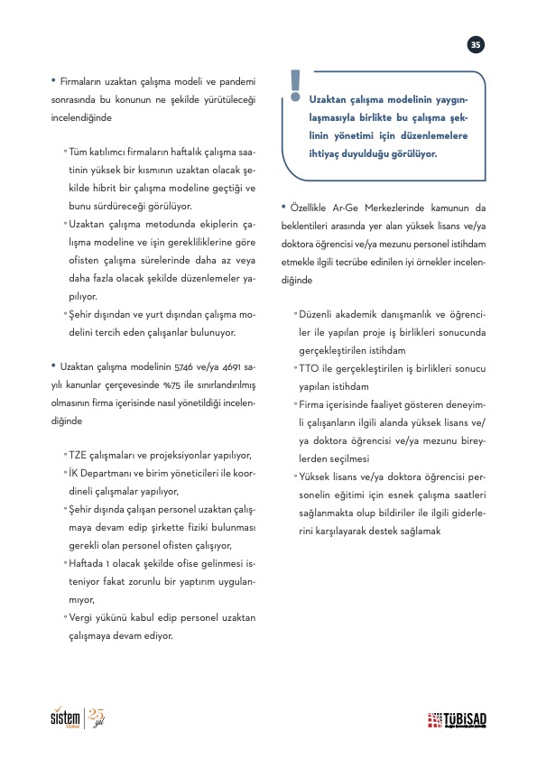 Ar-Ge Merkezi kuran ve Teknoloji Geliştirme Bölgeleri içerisinde ofis yapılanmasına sahip olan firmaların önemli bir kısmı bilişim sektöründe faaliyet göstermektedir. Gerek pandemi sonrasında değişen çalışma koşulları gerekse her geçen gün daha fazla sayıda firmanın bu oluşumlara dahil olması gibi sebeplerle, ihtiyaçların ne yönde değiştiği ve bu ihtiyaçlara hangi yenilik öneriyle çözüm bulunabileceği değerlendirilmiştir. Bilişim firmalarının aktif katılımıyla gerçekleştirilen çalışmada İnsan Kaynakları, Finansal Yönetim ve Erişimi ve İş Birliği ve Gelişim Fırsatları başlıklarına odaklanılmıştır.