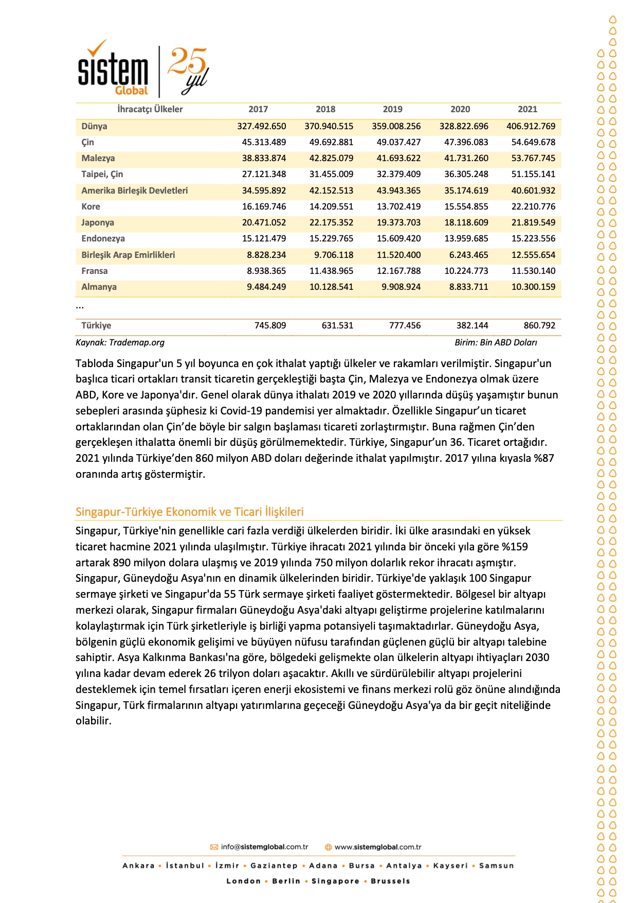 - Singapur, ithalatının yaklaşık yarısını ASEAN bölgesinden gerçekleştiren bir ülke olmakla beraber bölgenin en önemli ülkelerinden biridir. Dünya Bankası tarafından yapılan, İş Yapma Kolaylığı Endeksi’nde uzun yıllardır 2. sırada yer almaktadır. Singapur'un Hindistan ve Pasifik Okyanusu arasındaki stratejik konumu ve gelişmiş rafineri ve depolama altyapısı, ülkeyi önemli bir petrol ürünleri işleme ve ticaret merkezi haline getirmiştir. Ancak Hindistan, Malezya ve Tayland'da rafineri sektörüne yapılan yatırımlarla Singapur'un bu sektördeki üstün konumu bozulmaya başlamış ve diğer ülkeler için çeşitli fırsatlar ortaya çıkmıştır.